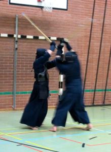 Jetzt wurde die Rüstung angelegt und wie gewohnt Partnerweise gegenüber Aufstellung genommen. Arthur machte jede Anforderung mit einem Partner vor. Von großen über kleine Men-Schläge ging es sehr gut aufbauend zu Kombinationsschlägen zu den Techniken Debana, Hikibana, Renzoku (Nidan und Sandan). In der letzten Stufe vor dem Ji-Geiko waren Kontertechniken des Angegriffenen gefragt ( Nuki, Kaeschi, Suriage). Arthur steigerte während des Trainings den Spannungsboden immer höher und das hatte folgendes Ergebnis: